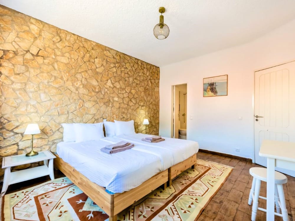Das Haus umfasst eine Etage mit zwei Doppelzimmern – eines mit einem Doppelbett und das andere mit zwei Einzelbetten. Beide Zimmer teilen sich ein Bad sowie eine voll ausgestattete Küche mit Essbereich und kleinem Wohnzimmer.
